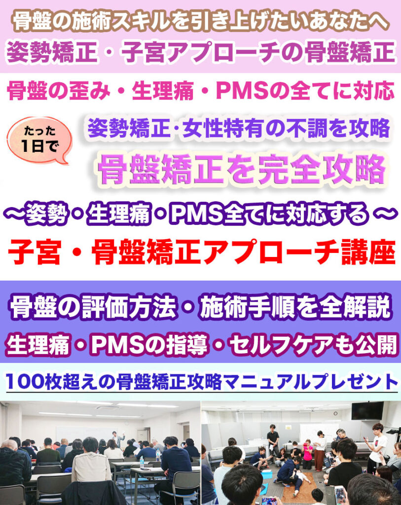 子宮・生理痛・PMS・骨盤矯正の知識・アプローチをまとめて講座です。